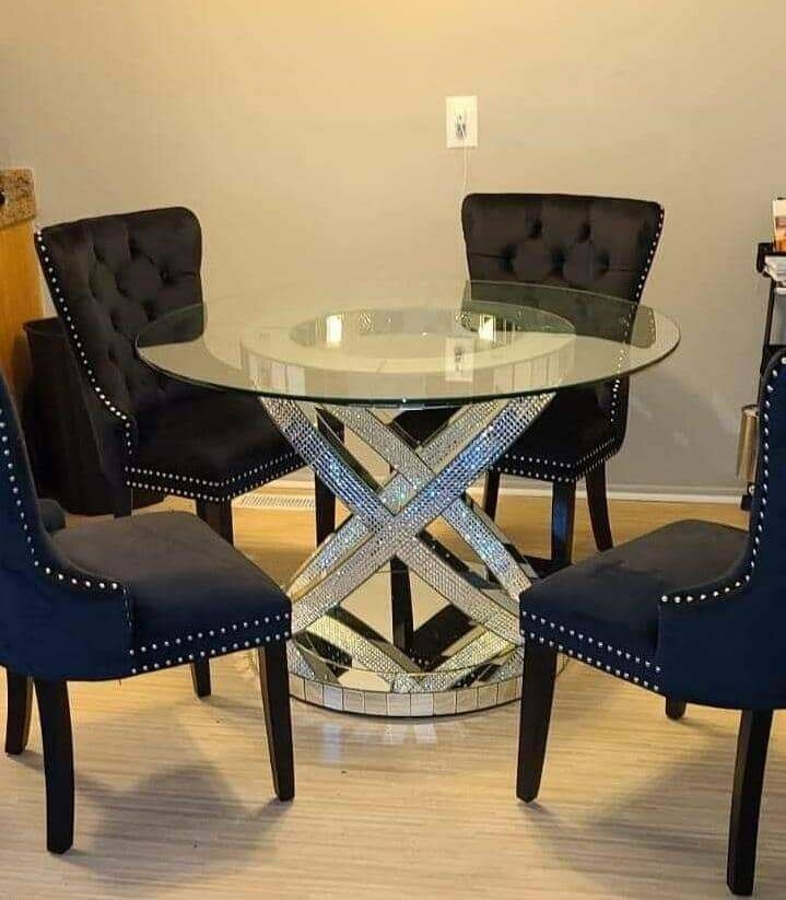 Éléquez votre salle à manger avec cette table ronde en verre et son pied en métal brillant. Parfaite pour les repas en famille ou entre amis.