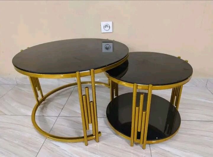 Ensemble de 2 tables basses rondes en marbre blanc et métal doré. Design élégant et moderne pour salon contemporain.