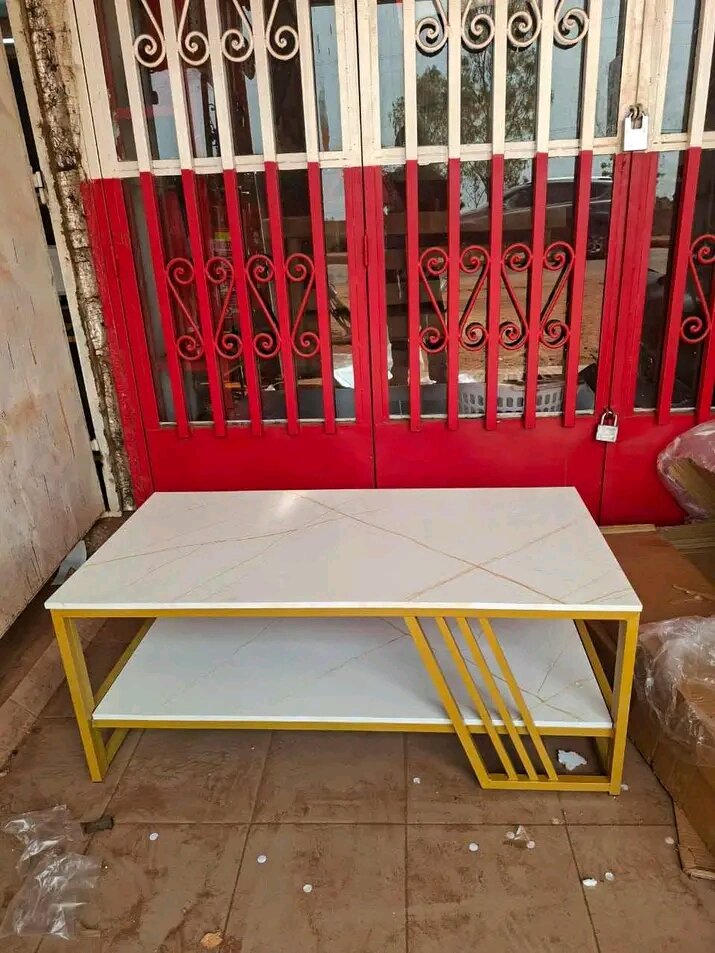 Élégante table basse avec plateau en marbre et structure métallique jaune. Idéale pour le salon, design moderne et robuste.
