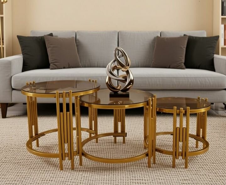 Élégante table basse ronde en métal doré avec plateau en verre, parfaite pour un salon moderne. Idéale pour les intérieurs de luxe.