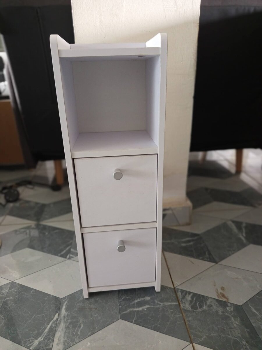 Meuble de rangement idéal pour les espaces restreints. Deux tiroirs et une étagère pour un accès facile à vos affaires.