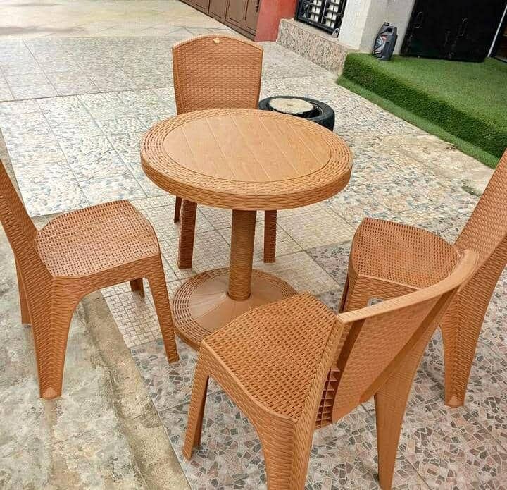 Ensemble de table et chaises en rotin pour jardin ou terrasse. Conçu pour 4 personnes, il est idéal pour des moments de détente en plein air. Résistant aux intempéries, cet ensemble est parfait pour meubler votre espace extérieur.