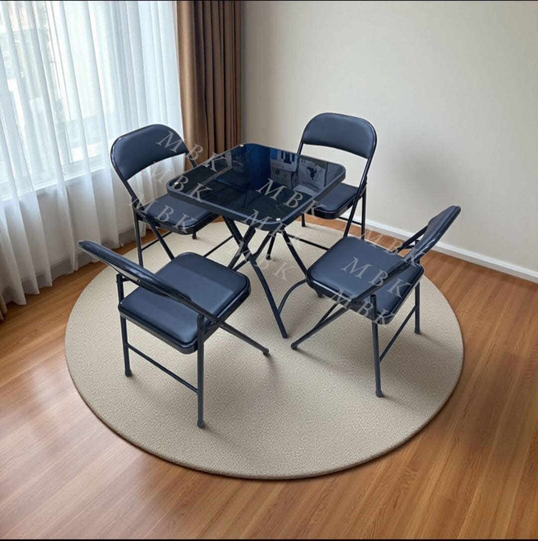 Table et chaises pliables en métal robuste et textile durable pour un usage en extérieur. Idéal pour les pique-niques, camping ou jardin.
