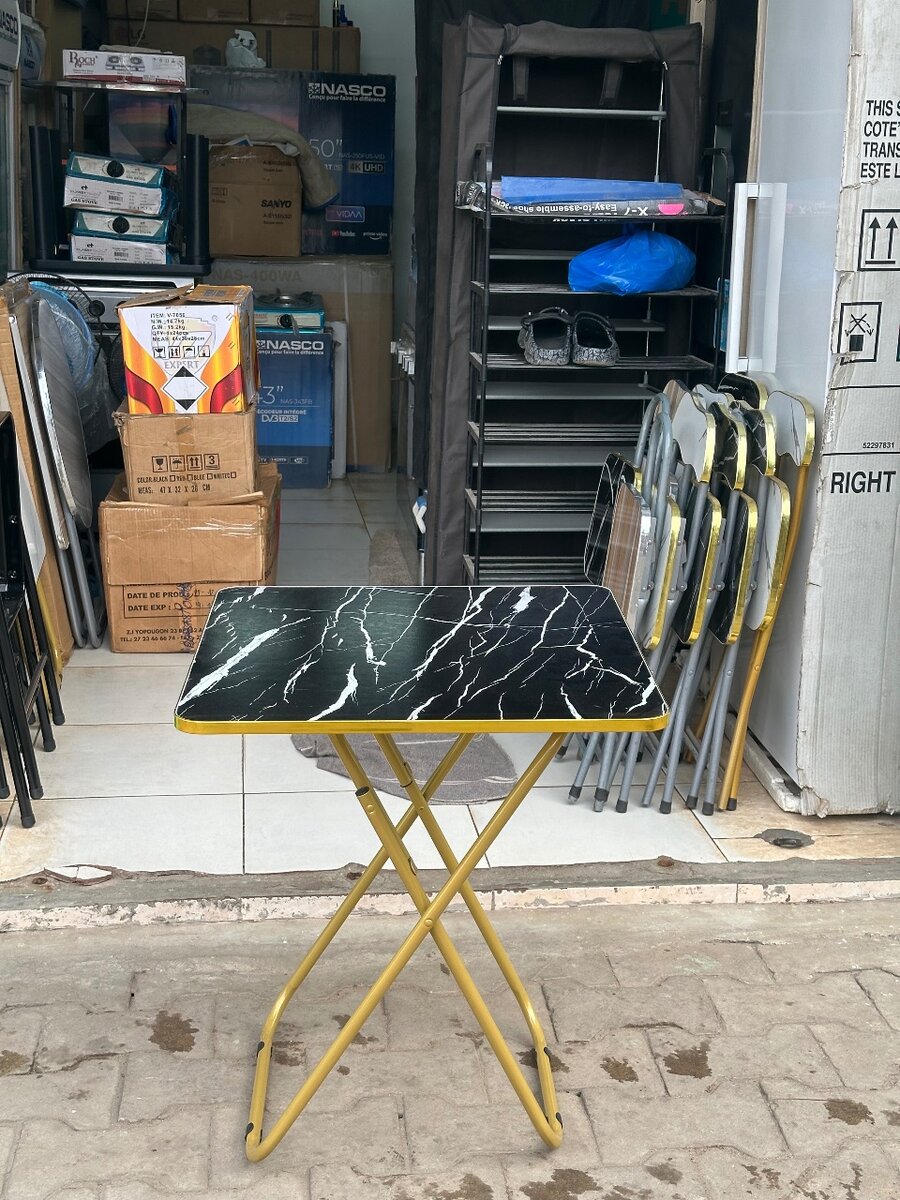 Cette élégante table pliante avec un dessus effet marbre est idéale pour les petits espaces. Pratique et stylée, elle est parfaite pour les repas, le travail ou comme table d'appoint.