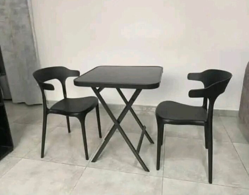 Ensemble compact pour 2 personnes, idéal pour les petits espaces. Table et chaises en métal noir, design simple et robuste. Parfait pour la cuisine, le balcon ou le jardin.