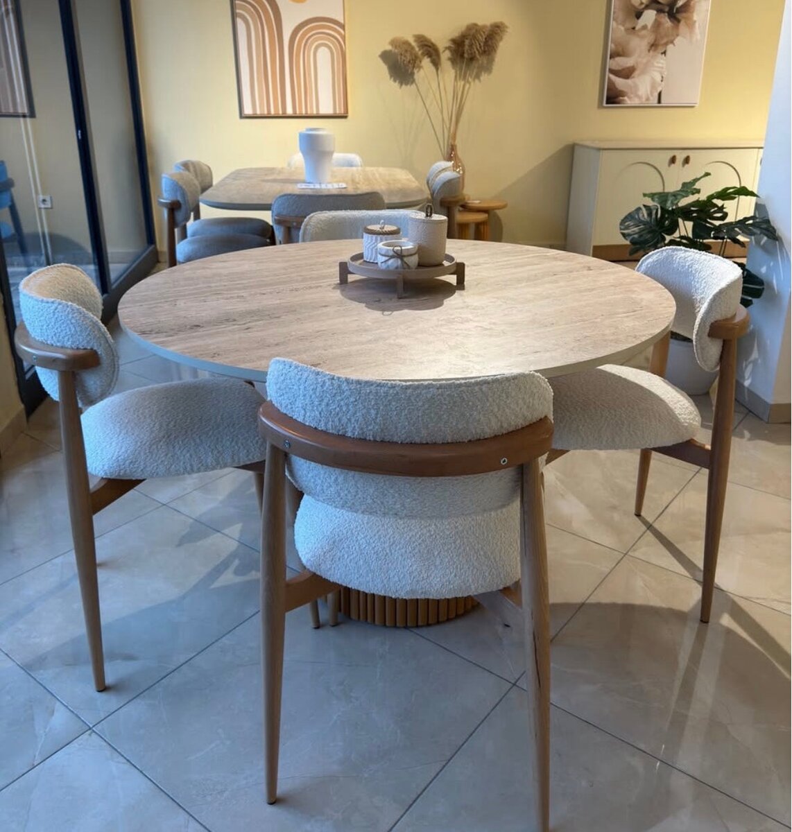 Table ronde en bois avec chaises rembourrées douces, idéale pour ajouter une touche de sophistication à votre salle à manger. Fabriquée avec des matériaux de haute qualité, elle offre confort et élégance pour vos repas quotidiens ou événements spéciaux.
