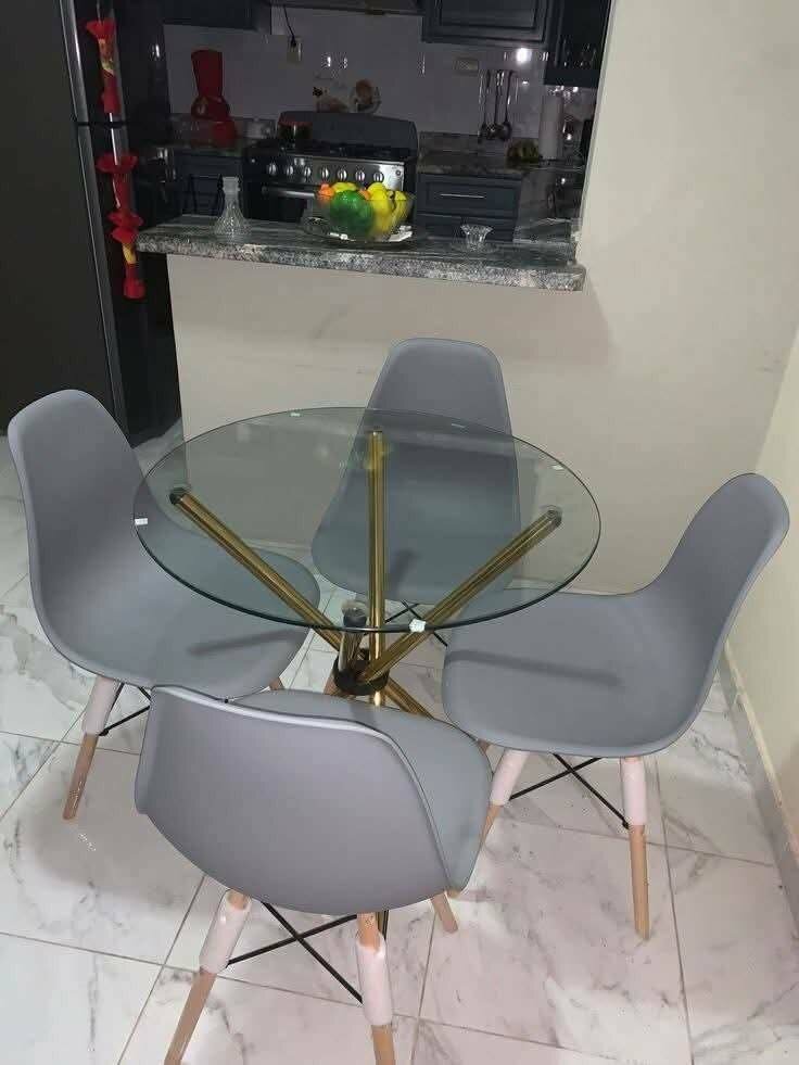 Élégante table ronde en verre avec quatre chaises grises. Idéale pour la salle à manger ou la cuisine moderne. Structure robuste et design contemporain pour un intérieur stylé.