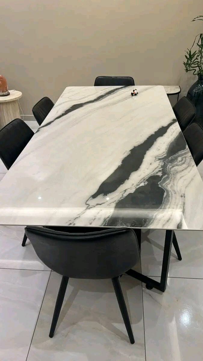 Table à manger élégante avec plateau en marbre blanc et pieds métalliques noirs. Design moderne et robuste, parfait pour les dîners en famille ou entre amis. Surface résistante aux rayures et facile à nettoyer.