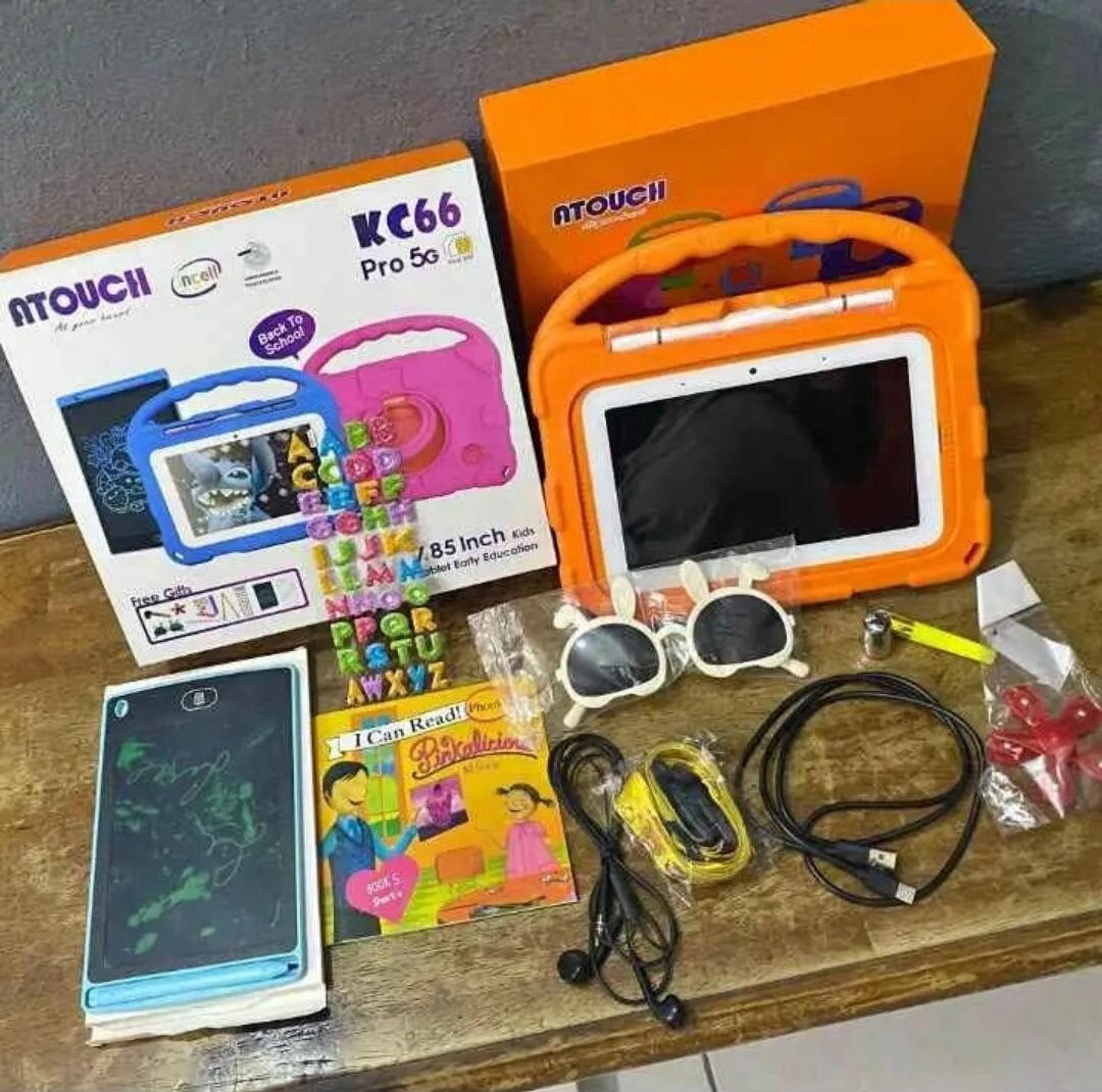 Tablette éducative pour enfants avec étui robuste. Écran tactile 7.85 pouces, applications ludiques, apprentissage interactif. Idéal pour l'éducation à la maison. Inclut accessoires : lunettes de soleil, ardoise électronique câble USB, écouteurs. Parfait pour stimuler la créativité et l'apprentissage.