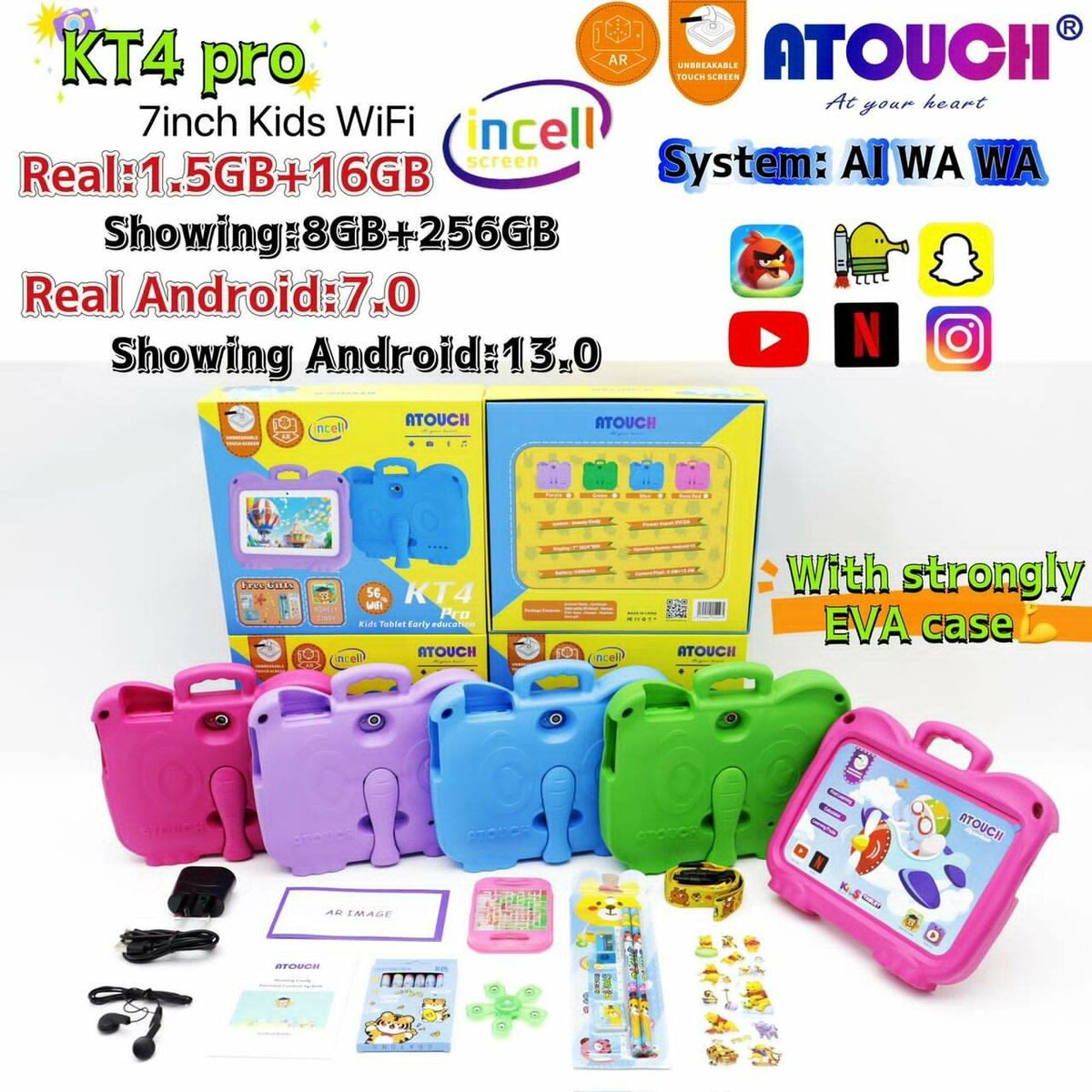La tablette ATOUCH KT4 Pro 7 pouces est parfaite pour les enfants. Avec 1,5 Go de RAM et 16 Go de stockage, elle est idéale pour l'apprentissage et le divertissement. Fonctionnant sous Android 7.0, elle offre de nombreuses applications éducatives et ludiques. Son étui EVA robuste assure une protection efficace.