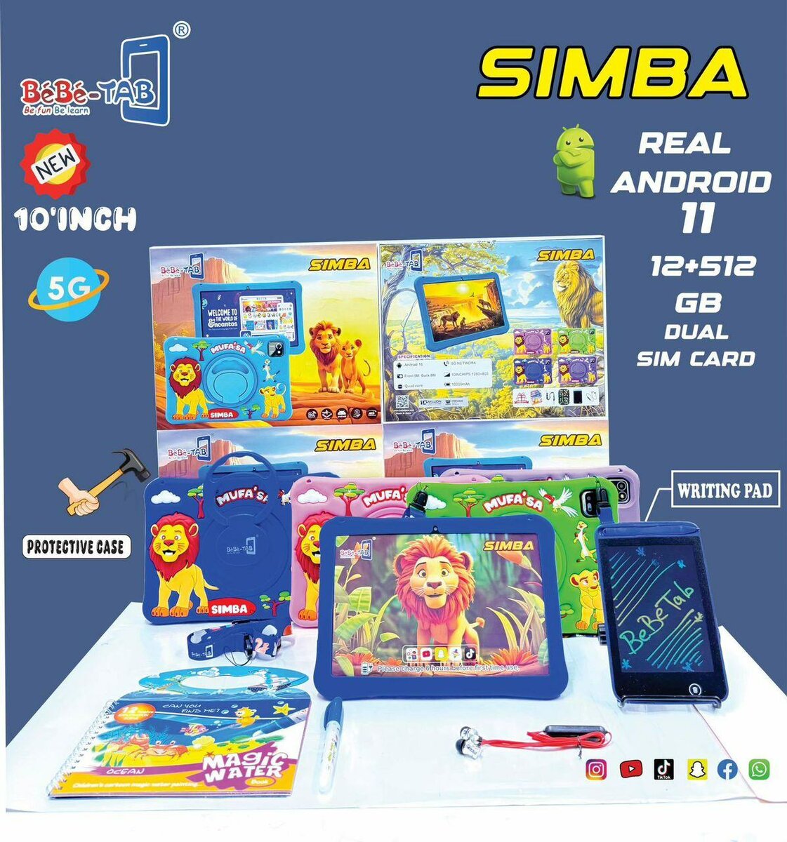 Tablette SIMBA 10 pouces pour enfants avec Android 11, 12+512 Go, 5G et double SIM. Inclut un étui protecteur et un stylet. Éducatif et ludique, idéal pour le développement des petits.