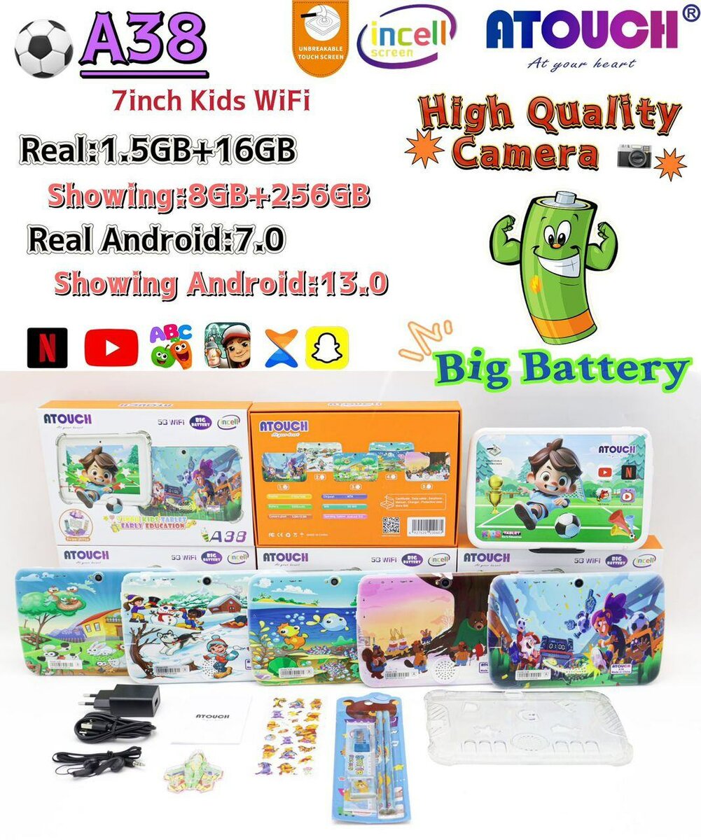 Offrez à votre enfant la tablette ATOUCH A38, dotée d'un écran 7 pouces parfait pour l'apprentissage et le divertissement. Avec 1.5GB de RAM et 16GB de stockage, c'est idéal pour les jeux et les applications éducatives. Android 7.0 assure une expérience fluide. Profitez de la caméra haute qualité pour capturer chaque moment précieux. Dotée d'une grande batterie pour une utilisation prolongée. Parfait pour les enfants explorateurs!