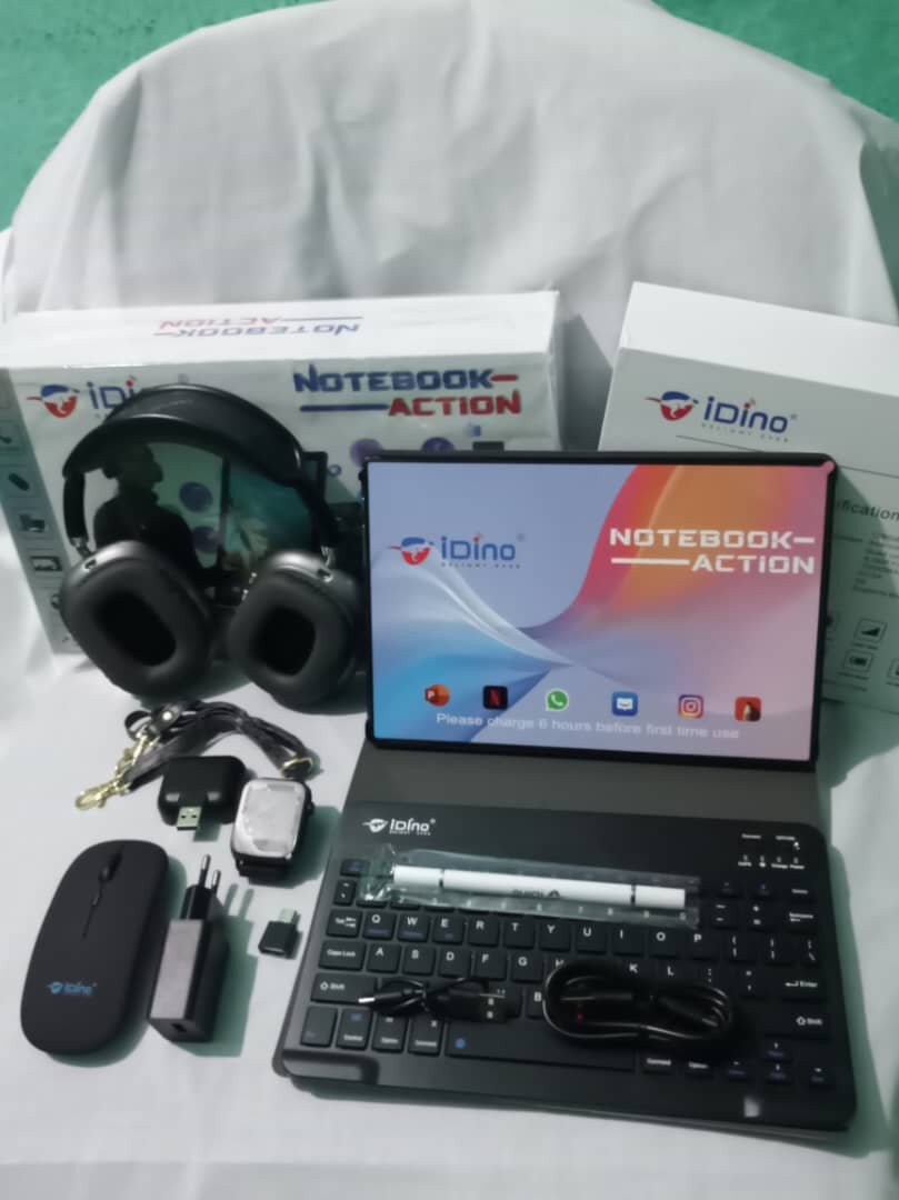 Tablette professionnelle IDINO Notebook action Clavier Bluetooth Montre connecter Casque bluetooth Dual sim android+12.0 Ecran10 pouces Mémoire 512 gb RAME 8Go Double caméras Connectivité Wifi,Bluetooth,+5G Batterie:+10000mAh Prix 60000 fcfa