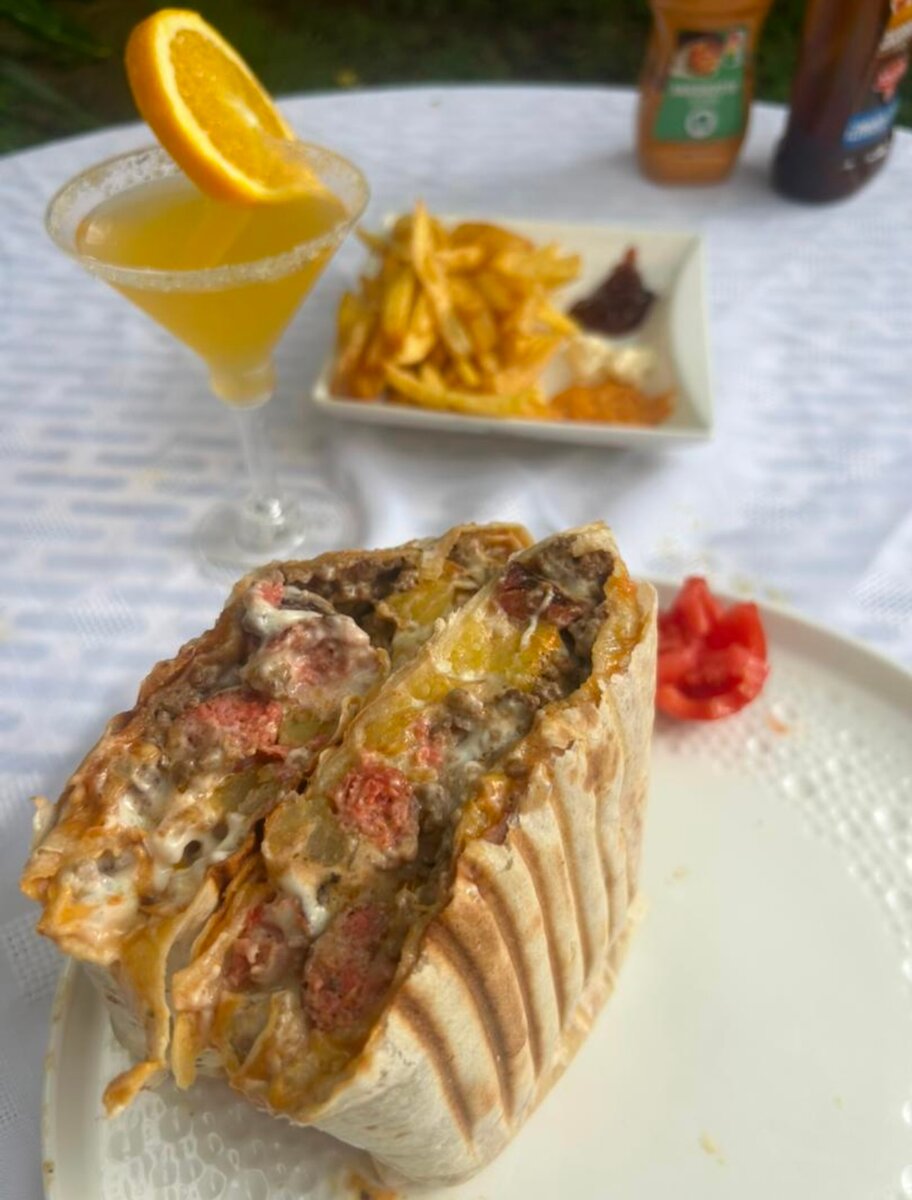 Tacos de Taille (XL) contenant des frites et accompagné votre viande au choix ( poulet, viande hachée ou merguez) et sauces au choix(samouraï, algerienne, barbecue, mayonnaise, burger et pour finir, une sauce fromagère par dessus.