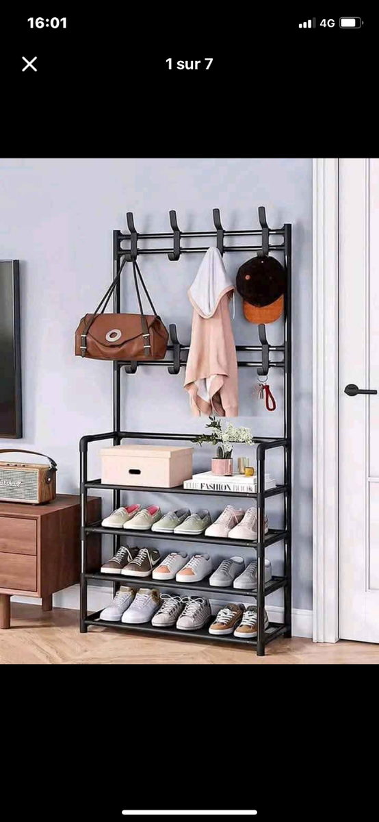 Organisez votre entrée avec style grâce à cette étagère de rangement multifonctionnelle. Dotée de crochets pour manteaux et chapeaux, ainsi que de plusieurs niveaux pour chaussures, elle optimise l'espace et ajoute une touche moderne à votre intérieur. Idéale pour un foyer bien rangé, elle est l'accessoire parfait pour accueillir vos invités.