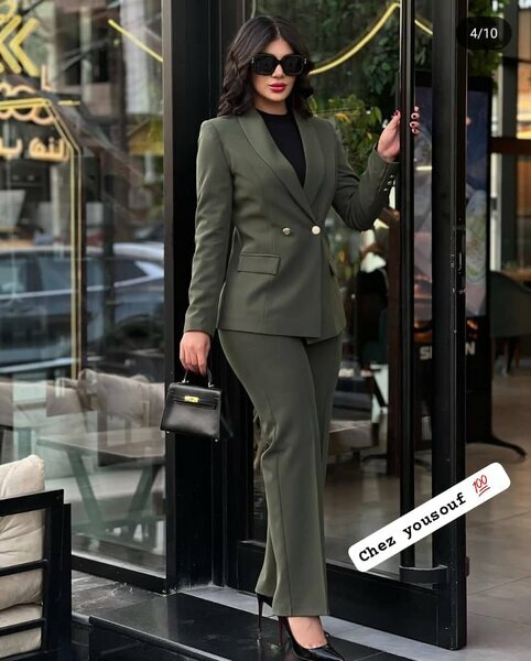 Tailleur-pantalon femme chic (vert), veste croisée, style moderne élégant pour affaires ou cérémonies. Finitions haut de gamme, tendance et classe.