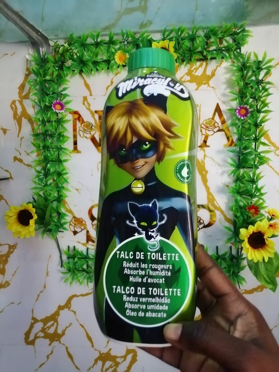 Talc de toilette pour enfants, inspiré du personnage Chat-Noir de Miraculous. Formulé pour réduire les rougeurs et absorber l'humidité, avec de l'huile d'avocat naturelle.