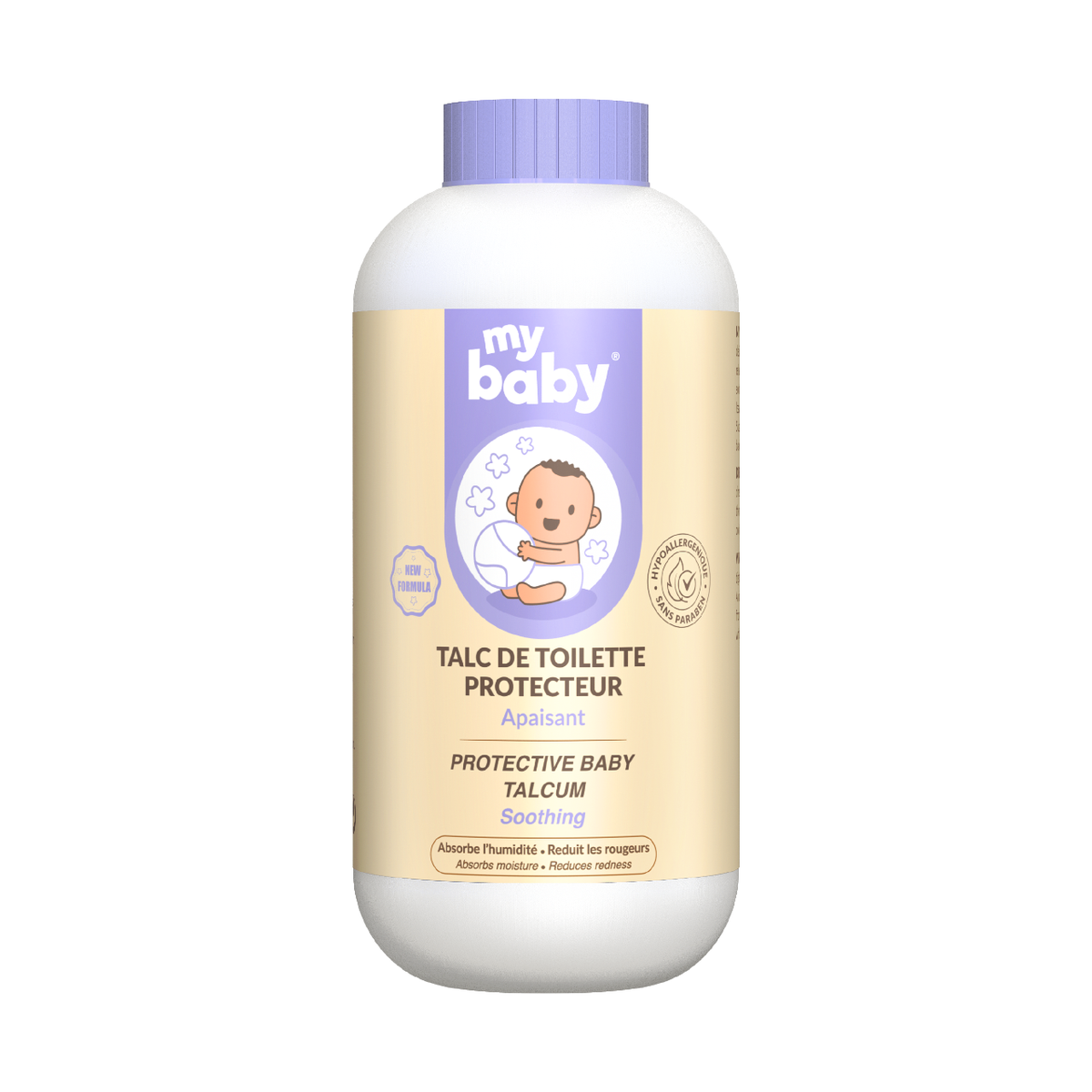 "Spécialement adapté à la toilette quotidienne des bébés et des peaux délicates, le talc de toilette My Baby prévient les risques de rougeurs et d'irritation, grâce à son fort pouvoir d'absorption. Sa poudre fine protège et adoucit la peau."