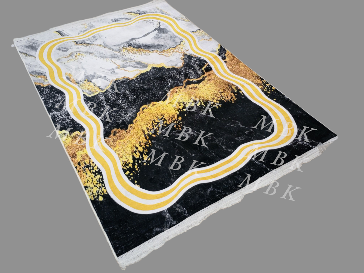 Ajoutez une touche d'élégance à votre intérieur avec ce tapis moderne au design abstrait. Ses nuances dorées et noires créent un effet marbré unique qui s'harmonise parfaitement avec tout style de décoration. Idéal pour le salon ou la chambre, ce tapis offre confort et style. Transformez votre espace avec ce chef-d'œuvre artistique!