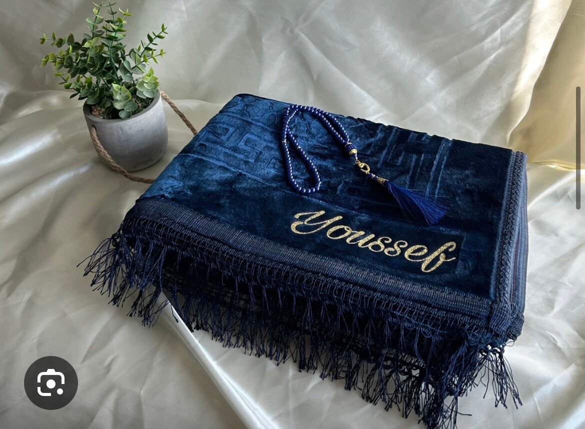 Un tapis de prière en velours bleu nuit, doux et luxueux au toucher. Il présente des motifs géométriques subtils et une finition soignée avec des franges fines assorties. Le prénom « Youssef » est brodé en fil doré, offrant une touche raffinée et personnalisée.