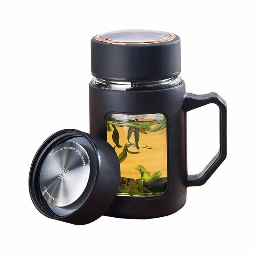 Profitez de votre thé préféré avec cette tasse isotherme élégante. Dotée d'un infuseur intégré, elle maintient votre boisson chaude et savoureuse plus longtemps. Idéale pour le bureau ou la maison.
