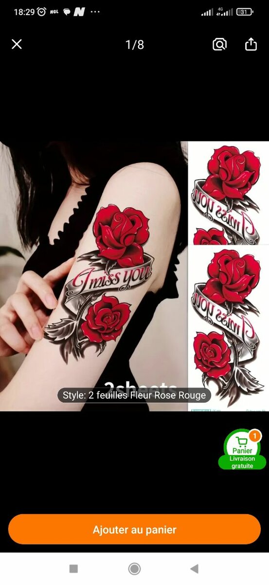 Tatouage temporaire élégant avec motif de roses rouges et texte 'I miss you'. Parfait pour une touche de style sans engagement. Idéal pour les événements spéciaux ou un look quotidien unique.