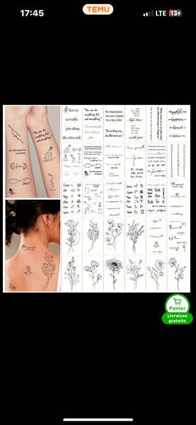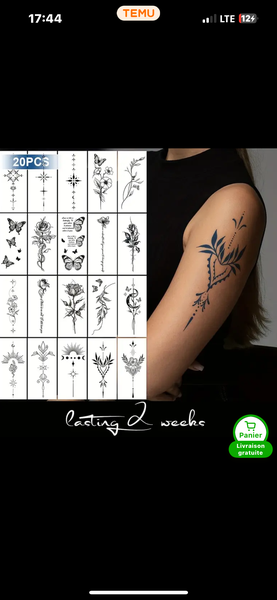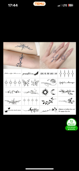 Explorez notre collection de tatouages temporaires artistiques et résistants à l'eau, parfaits pour toutes les occasions. Faciles à appliquer, ces designs apportent une touche unique et personnalisée à votre style, sans engagement permanent. Idéal pour exprimer votre créativité ou essayer de nouveaux looks!