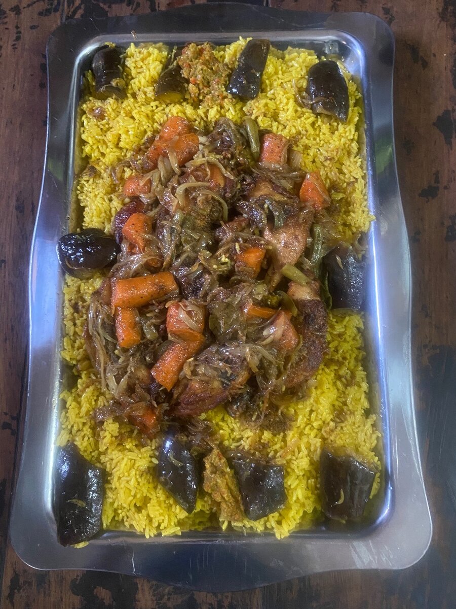 Dégustez ce plat de tchep au poulet accompagné des légumes carottes choux haricots vert le riz bien assaisonné et le poulet bien mariner et bien frit venez déguster vous serez pas déçus