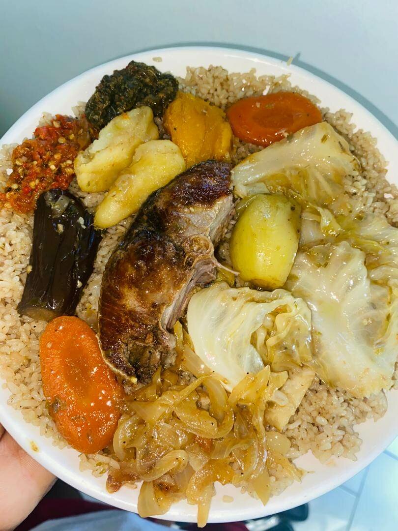 Découvrez ce savoureux plat de riz accompagné de légumes frais et de poisson frit
