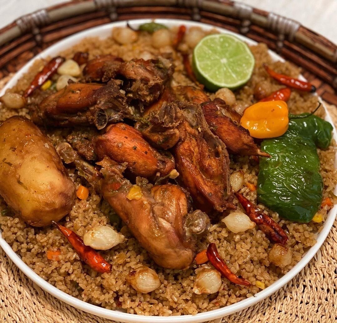 Savourez un plat de riz parfumé garni de poulet et de légumes frais et épices exotiques. Parfait pour un dîner spécial. Découvrez une explosion de saveurs à chaque bouchée avec ce repas réconfortant et élégant.