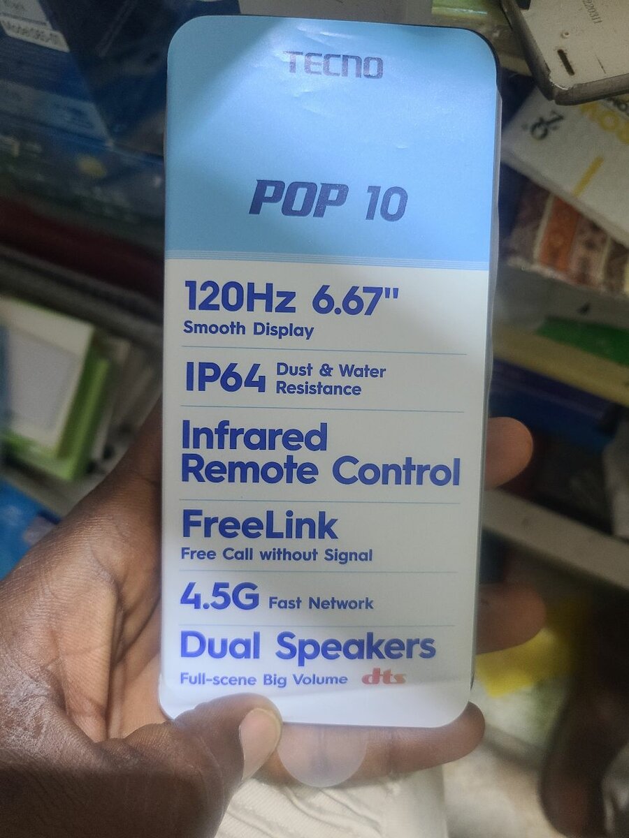 Découvrez le Tecno Pop 10 avec son écran fluide de 120Hz et 6.67 pouces. Profitez d'une résistance IP64 à la poussière et à l'eau, ainsi que du contrôle à distance infrarouge pour plus de confort. Connectivité 4.5G pour des appels sans signal avec FreeLink, et un son immersif grâce aux haut-parleurs doubles DTS. Idéal pour les utilisateurs modernes en quête de performance et polyvalence.