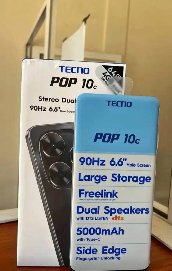 Découvrez le Tecno POP 10c, équipé d'un grand écran 6,6'' 90Hz, de haut-parleurs stéréo double DTS et d'une batterie 5000mAh avec charge rapide. Stockage généreux et design élégant.