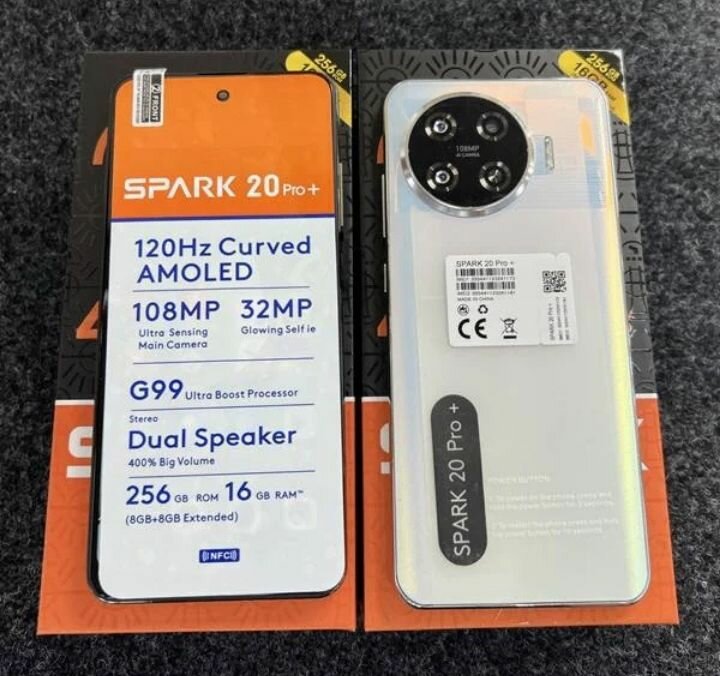 Découvrez le Tecno Spark 20 Pro +, smartphone équipé d'un écran AMOLED 120Hz, d'un processeur G99 Ultra Boost et de 256 Go de stockage. Idéal pour les utilisateurs exigeants.