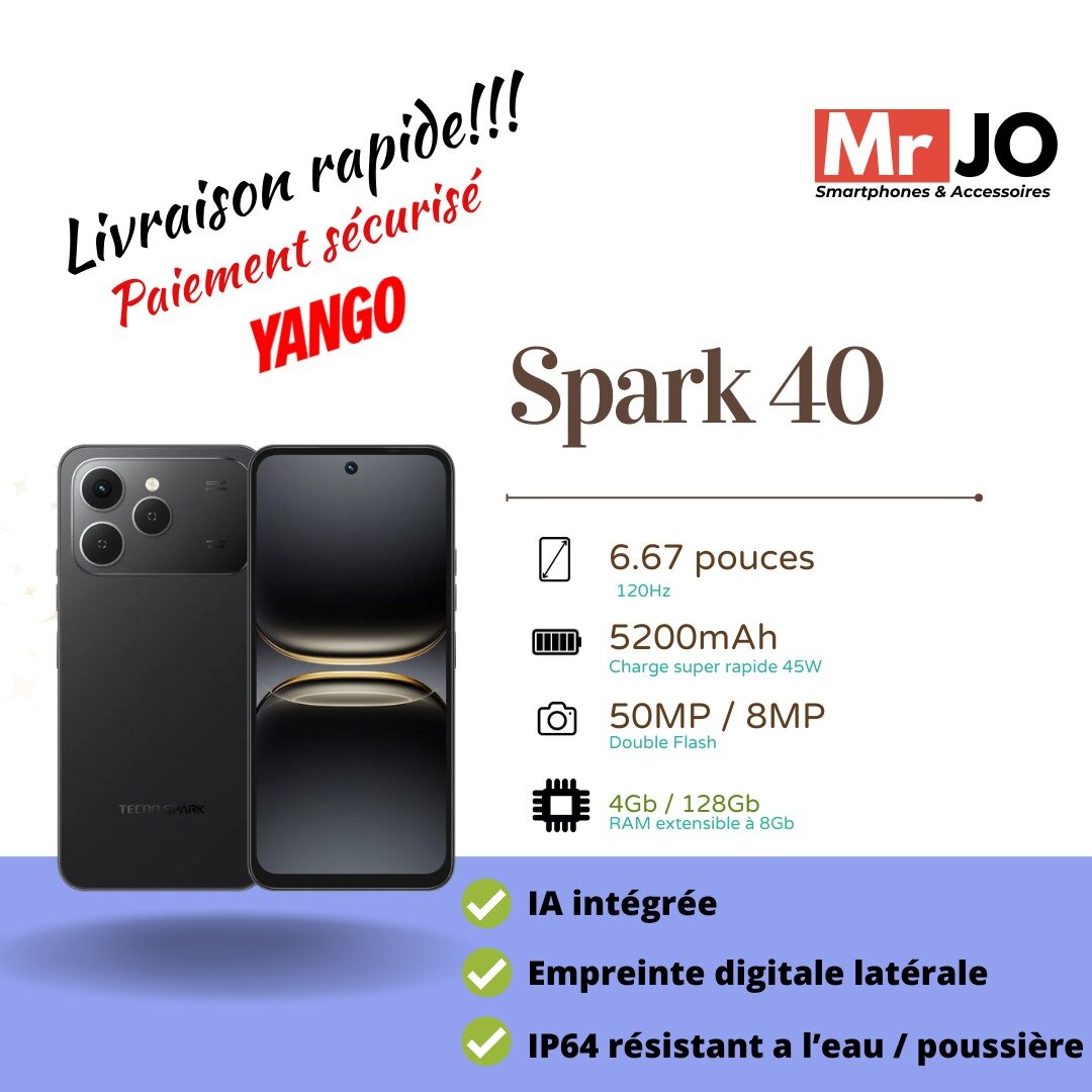 Découvrez le Smartphone TECNO Spark 40 avec écran 6.67 pouces et batterie 5200mAh. Profitez d'une photographie parfaite grâce à son appareil de 50MP. Idéal pour ceux qui recherchent performance et élégance. Résistant à l'eau (IP64) et équipé d'une IA intégrée. Parfait pour un usage quotidien intensif.