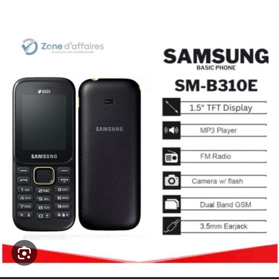 Découvrez le Samsung SM-B310E, un téléphone basique doté d'un écran TFT de 1,5", lecteur MP3, radio FM, appareil photo avec flash et prise jack 3,5mm. Idéal pour une communication simple et efficace.