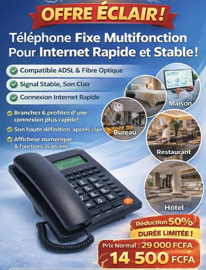 Téléphone fixe multifonction compatible ADSL et Fibre Optique pour une connexion internet rapide et stable. Signal stable, son clair et connexion internet rapide. Idéal pour la maison, le bureau, le restaurant ou l'hôtel.