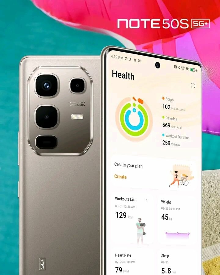 Découvrez le NOTE 50S 5G+, un smartphone performant et élégant. Suivez votre santé avec l'application intégrée, contrôlez vos entraînements, votre fréquence cardiaque et votre sommeil. Profitez d'une connectivité rapide 5G+ pour rester connecté en permanence. Design raffiné et technologie avancée.