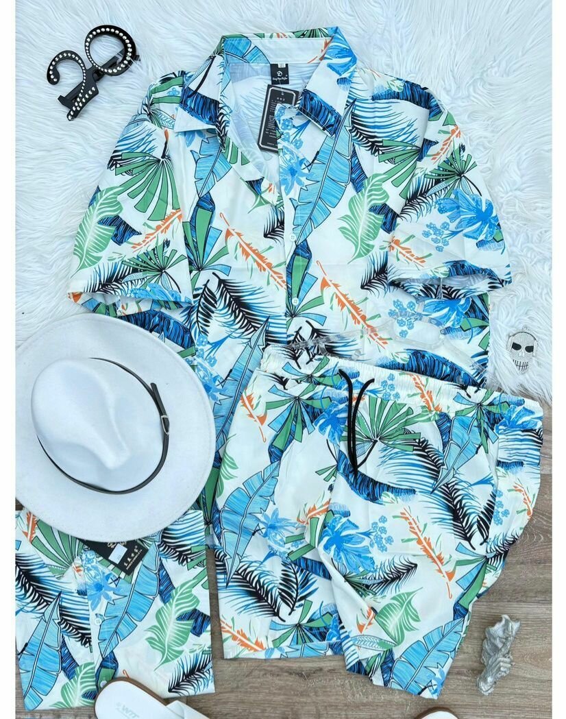 Élégante tenue d'été avec motifs tropicaux, parfaite pour des vacances ensoleillées. Confort et style garantis grâce à un design léger et respirant. Idéale pour plages et promenades estivales.