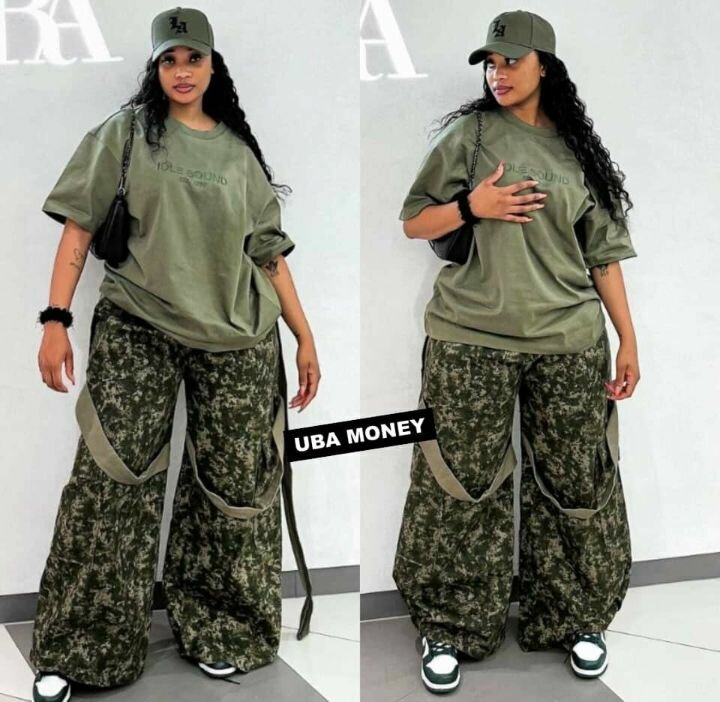 Pantalon ample camouflage et t-shirt vert, parfait pour un look urbain. Confortable et stylé pour les sorties quotidiennes. Idéal pour un style décontracté tendance.