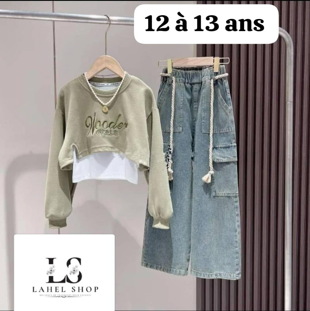 Ensemble chic et confortable pour filles de 12 à 13 ans, parfait pour un style décontracté. Comprend un sweat tendance et un pantalon large en denim. Idéal pour l'école et les sorties casual. Offrez à votre enfant le confort et l'élégance au quotidien.