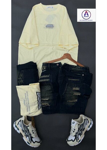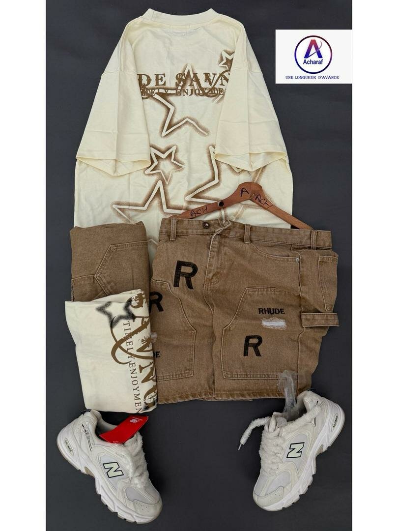 Découvrez notre ensemble Rhude pour un look urbain et tendance! Comprend un T-shirt imprimé originale, des shorts élégants et des baskets confortables New Balance. Idéal pour un style décontracté au quotidien. Parfait pour les sorties entre amis ou les balades en ville.