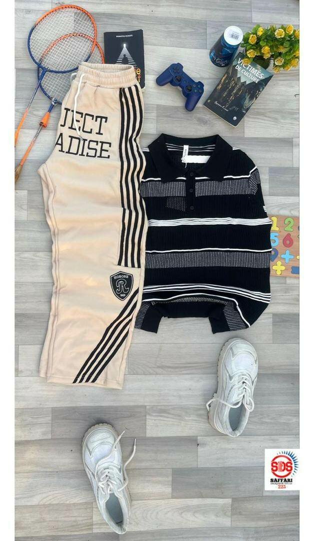 Optez pour ce look complet et stylé avec un polo noir à rayures et un pantalon beige confortable. Parfait pour les loisirs ou une partie de tennis grâce à sa coupe décontractée et sa matière douce. Associez-le avec vos baskets préférées pour un style encore plus urbain. Idéal pour se détendre ou participer à des activités sportives légères.