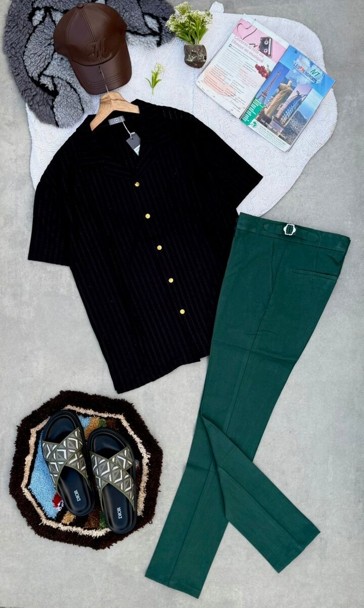 Découvrez cette élégante tenue pour homme comprenant une chemise noire à boutons dorés et un pantalon vert chic. Parfaite pour une soirée ou une occasion spéciale, cette combinaison offre confort et style. Ajoutez des accessoires pour un look complet.