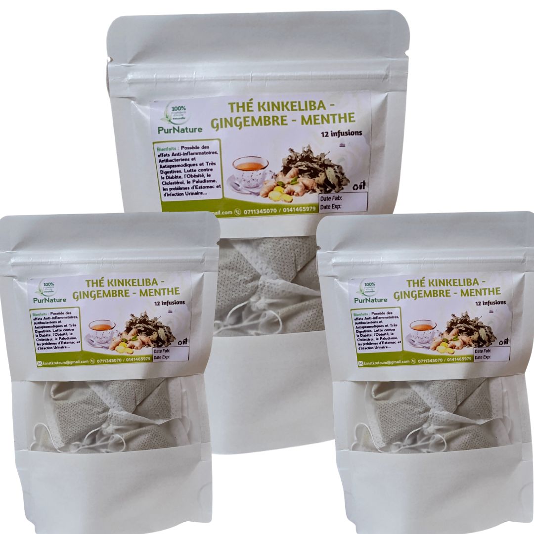 THÉ Kinkeliba - gingembre - menthe est une infusion délicieuse et pleine de bienfaits pour la santé , notamment la gestion du poids, la protection du foie, des propriétés anti-inflammatoires et antibactériennes.