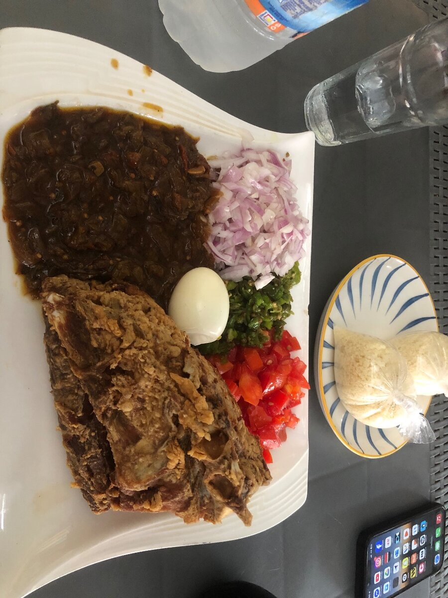 Savourez un authentique repas africain comprenant poisson grillé, sauce épicée, légumes frais et œuf dur. Parfait pour un dîner exotique et nutritif. Découvrez la richesse des saveurs africaines dans votre assiette.