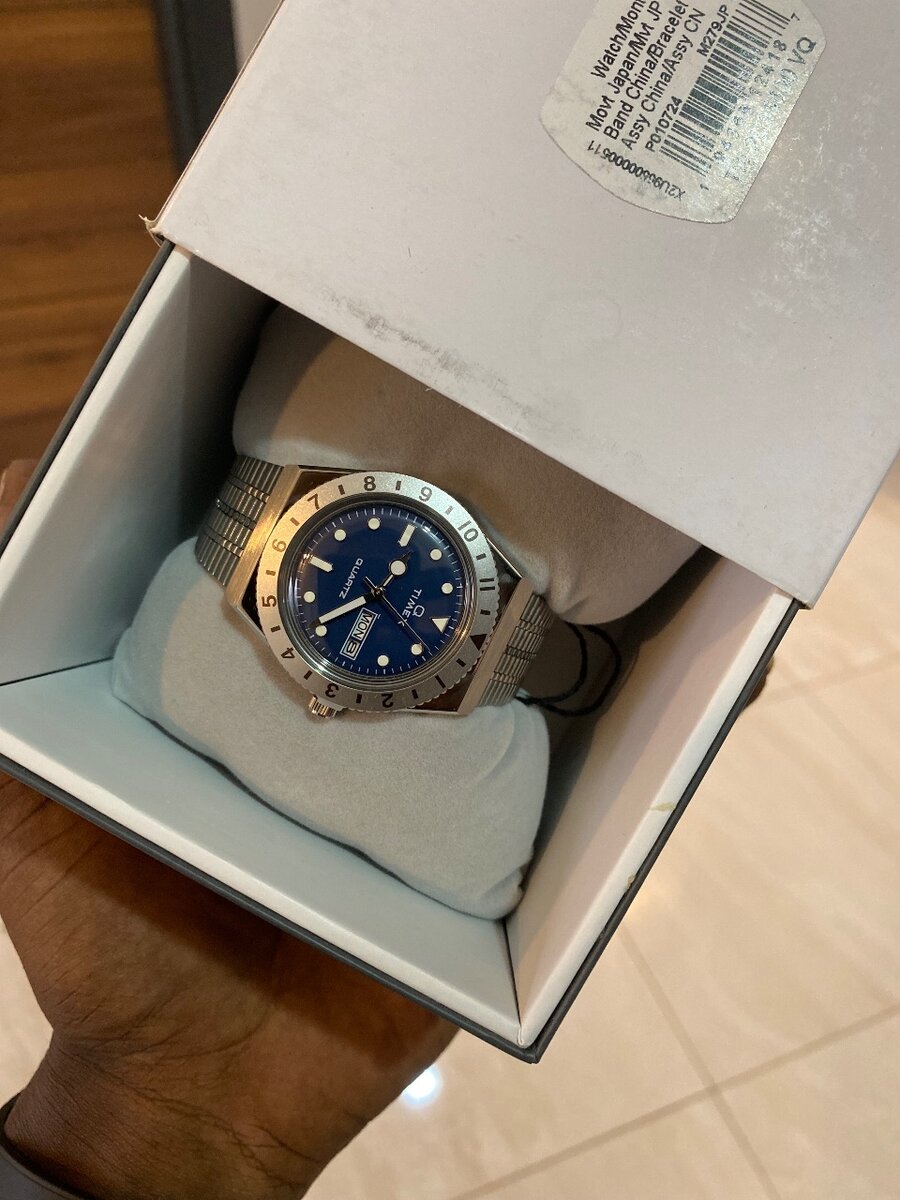 Timex Q watch : 36mm case, stainless steel band , water resistant to 50meters , day date window , quartz movement
