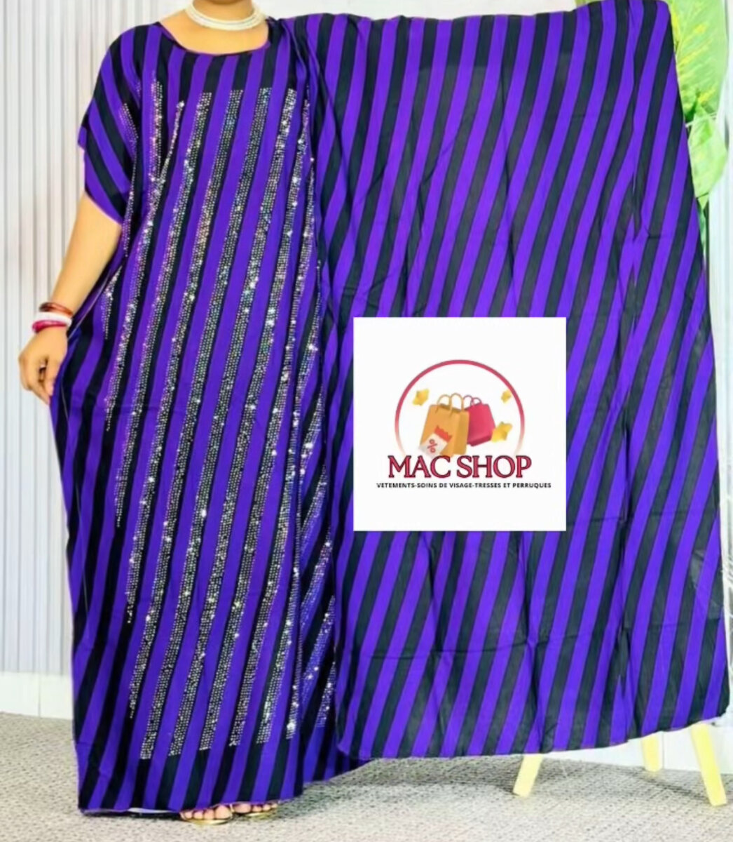 Découvrez ce magnifique tissu africain violet orné de bandes dorées. Idéal pour créer des vêtements élégants et tendances. Léger et confortable, parfait pour les occasions spéciales.