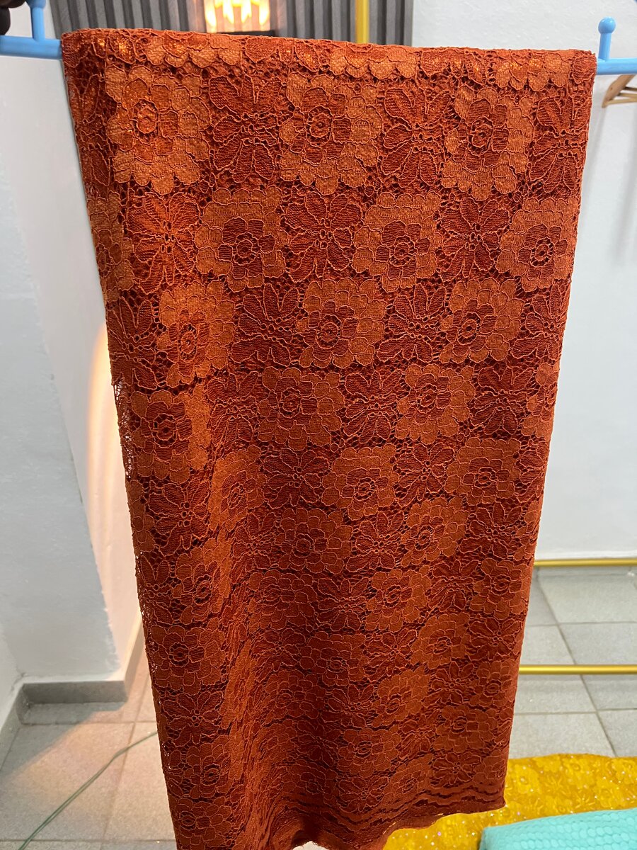 Magnifique tissu en dentelle orange avec motif floral, idéal pour la confection de vêtements élégants ou de décorations raffinées. Sa texture douce et son design unique ajoutent une touche de sophistication à n'importe quel projet. Parfait pour les robes, les jupes ou les accessoires.