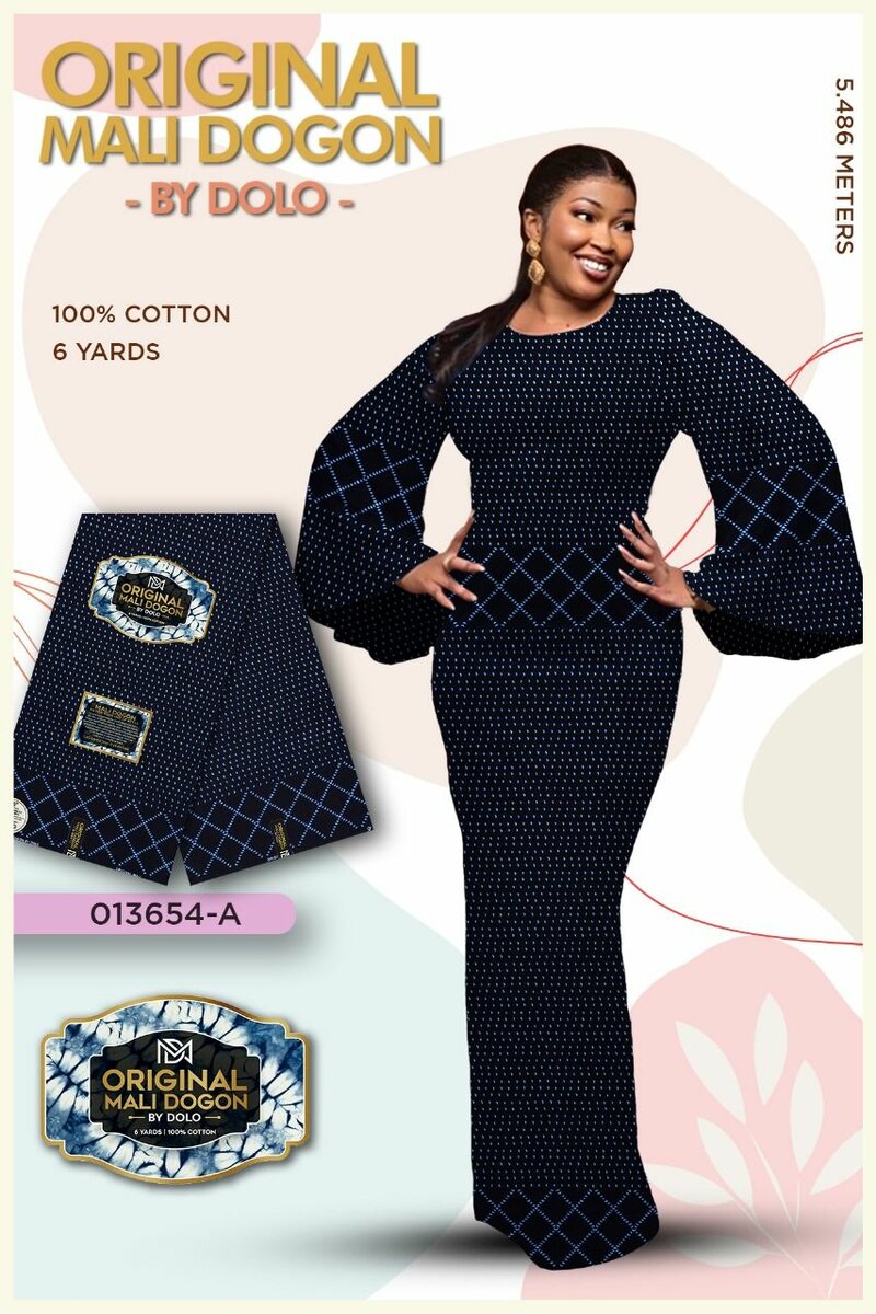 Découvrez le tissu en coton Original Mali Dogon par Dolo. Parfait pour vos créations textiles uniques. 100% coton, 6 yards, idéal pour des robes élégantes et confortables. Apportez une touche ethnique et chic à votre garde-robe avec ces motifs authentiques. Idéal pour toutes occasions, il est votre allié mode.
