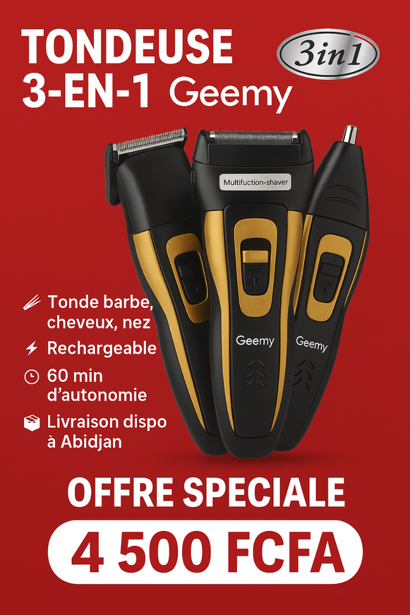 Découvrez la tondeuse 3-en-1 Geemy, idéale pour entretenir barbe, cheveux et nez. Elle est rechargeable, offrant 60 min d'autonomie, parfaite pour un usage à domicile ou en déplacement. Profitez de notre offre spéciale pour une efficacité professionnelle à portée de main!